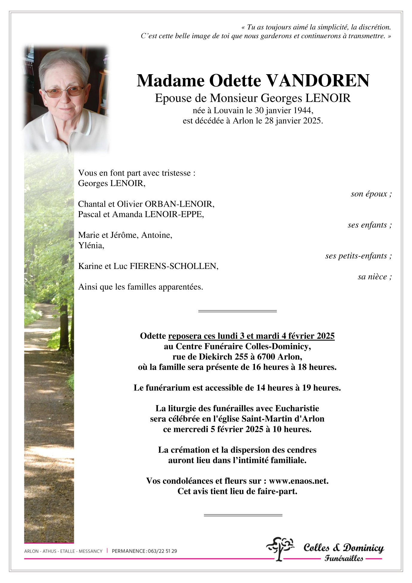 Décédée à Arlon (6700) le mardi 28 janvier 2025 à l'âge de 80 ans