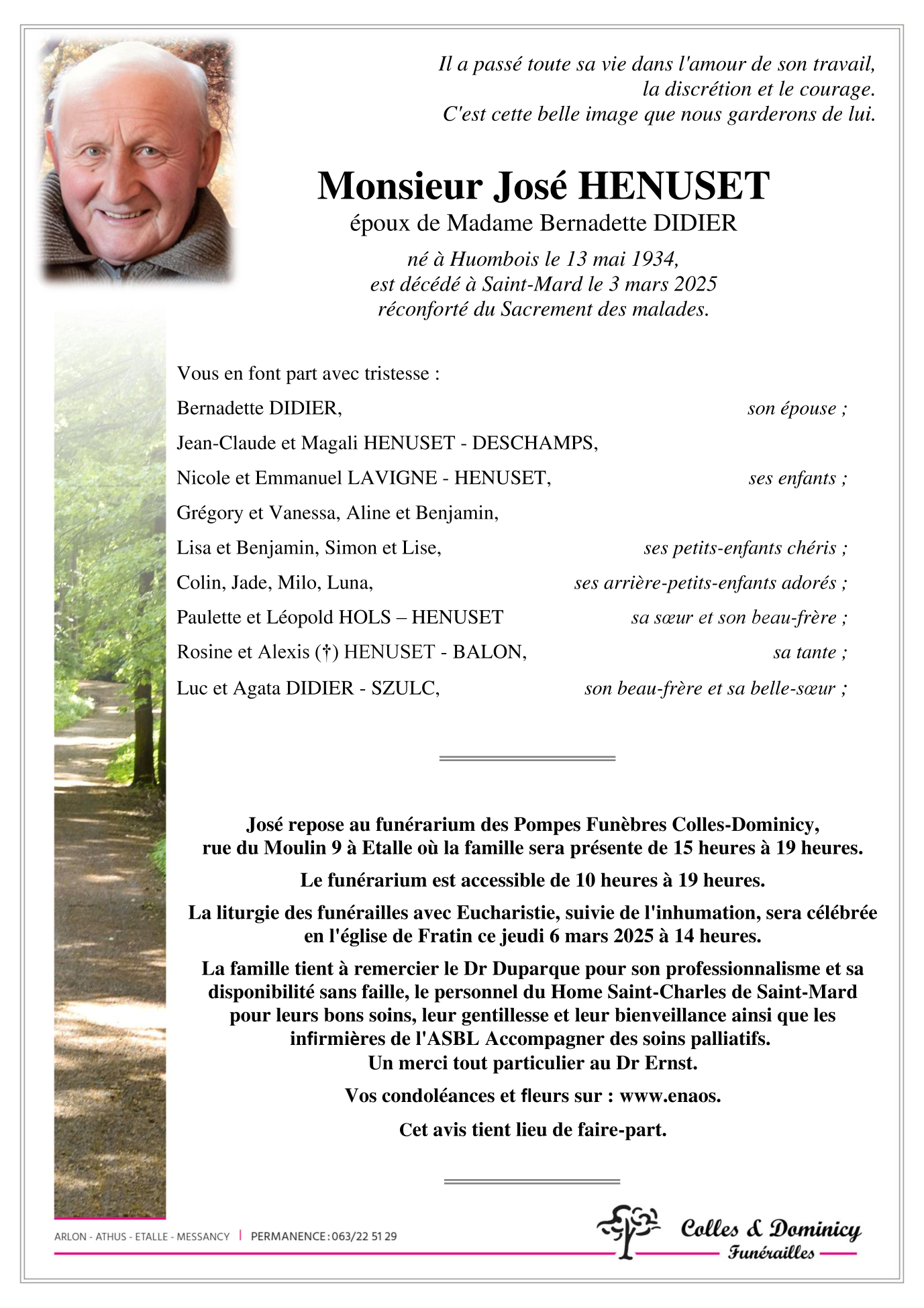 Décédé à Saint-Mard (6762) le lundi 3 mars 2025 à l'âge de 90 ans