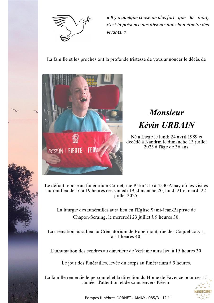 Décédé à Nandrin (4550) le dimanche 13 juillet 2025 à l'âge de 36 ans