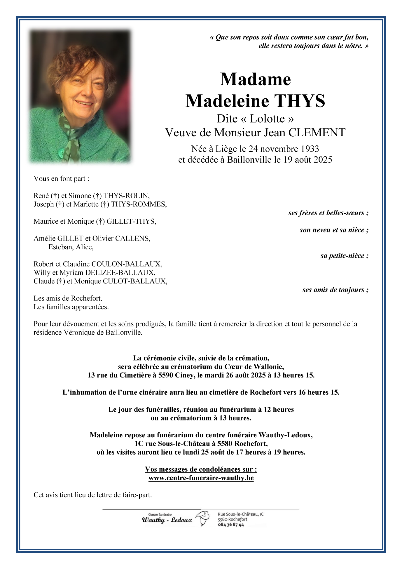 Fallecida en Baillonville (5377) el martes, 19 de agosto de 2025 a la edad de 91 años