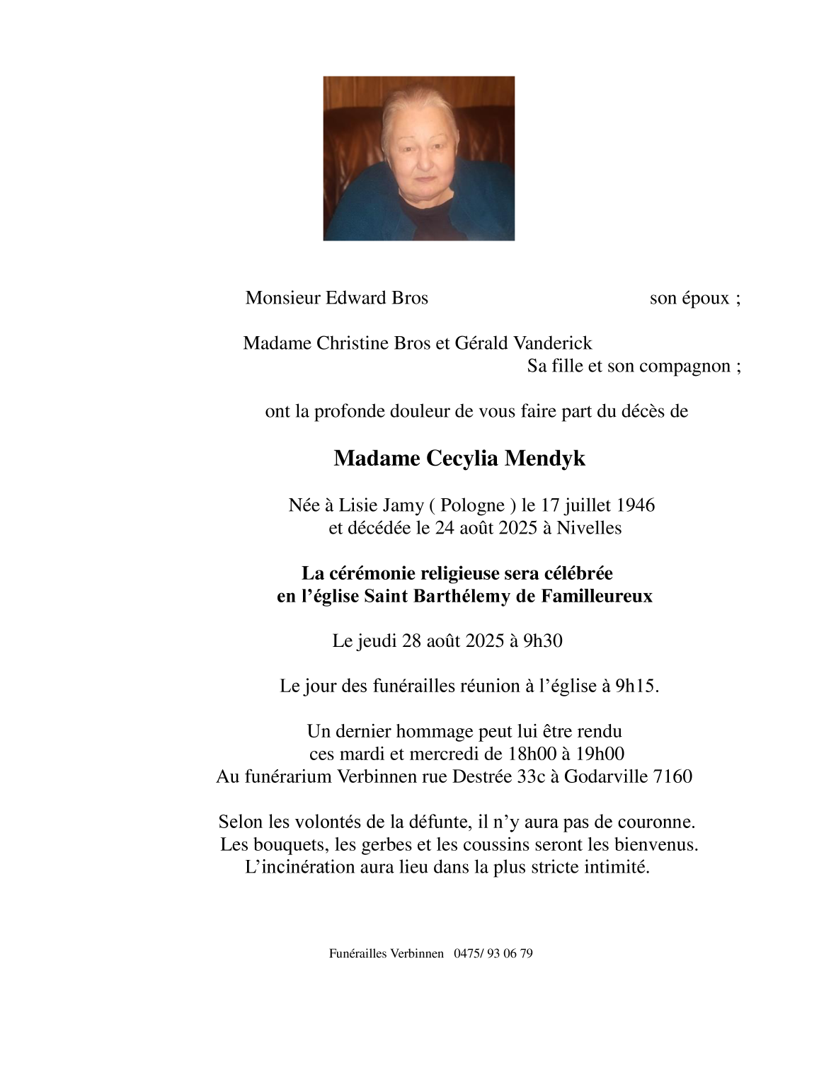 Décédée à Nivelles (1400) le dimanche 24 août 2025 à l'âge de 79 ans