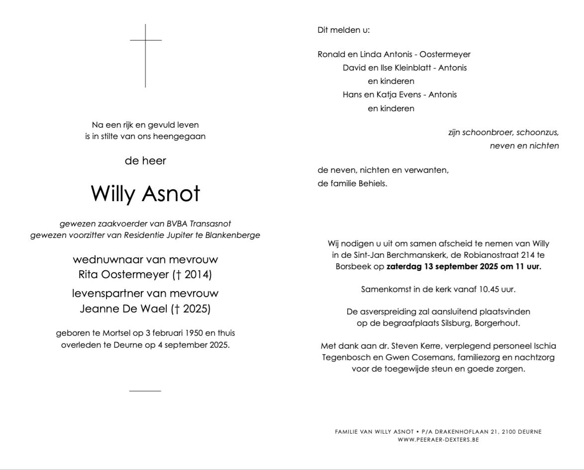 Décédé à Deurne (Antwerpen) (2100) le jeudi 4 septembre 2025 à l'âge de 75 ans