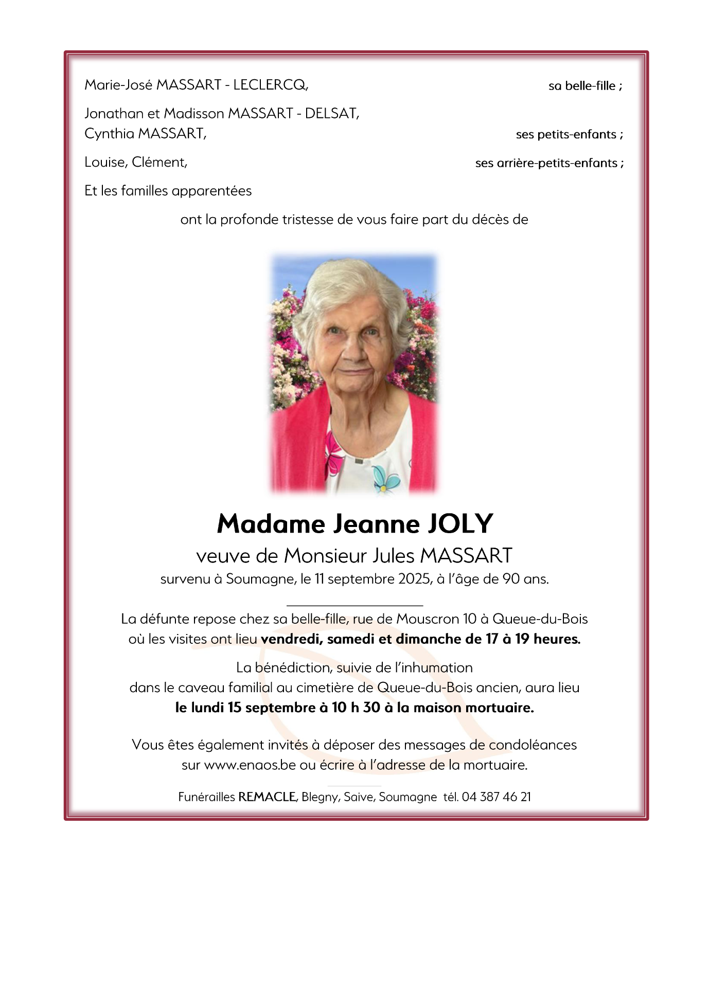Décédée à Soumagne (4630) le jeudi 11 septembre 2025 à l'âge de 90 ans