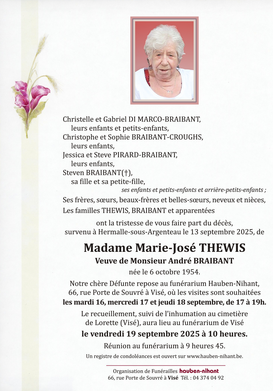 Décédée à Hermalle-sous-Argenteau (4681) le samedi 13 septembre 2025 à l'âge de 70 ans