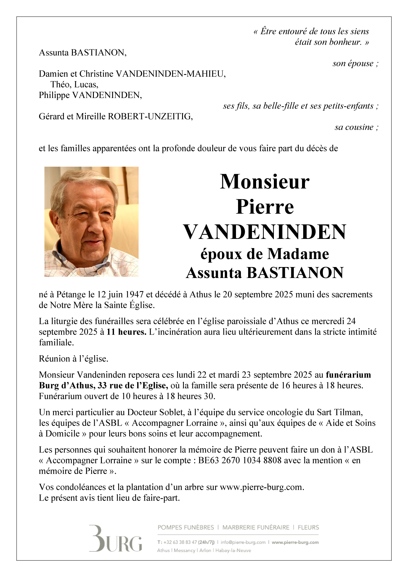 Décédé à Athus (6791) le samedi 20 septembre 2025 à l'âge de 78 ans