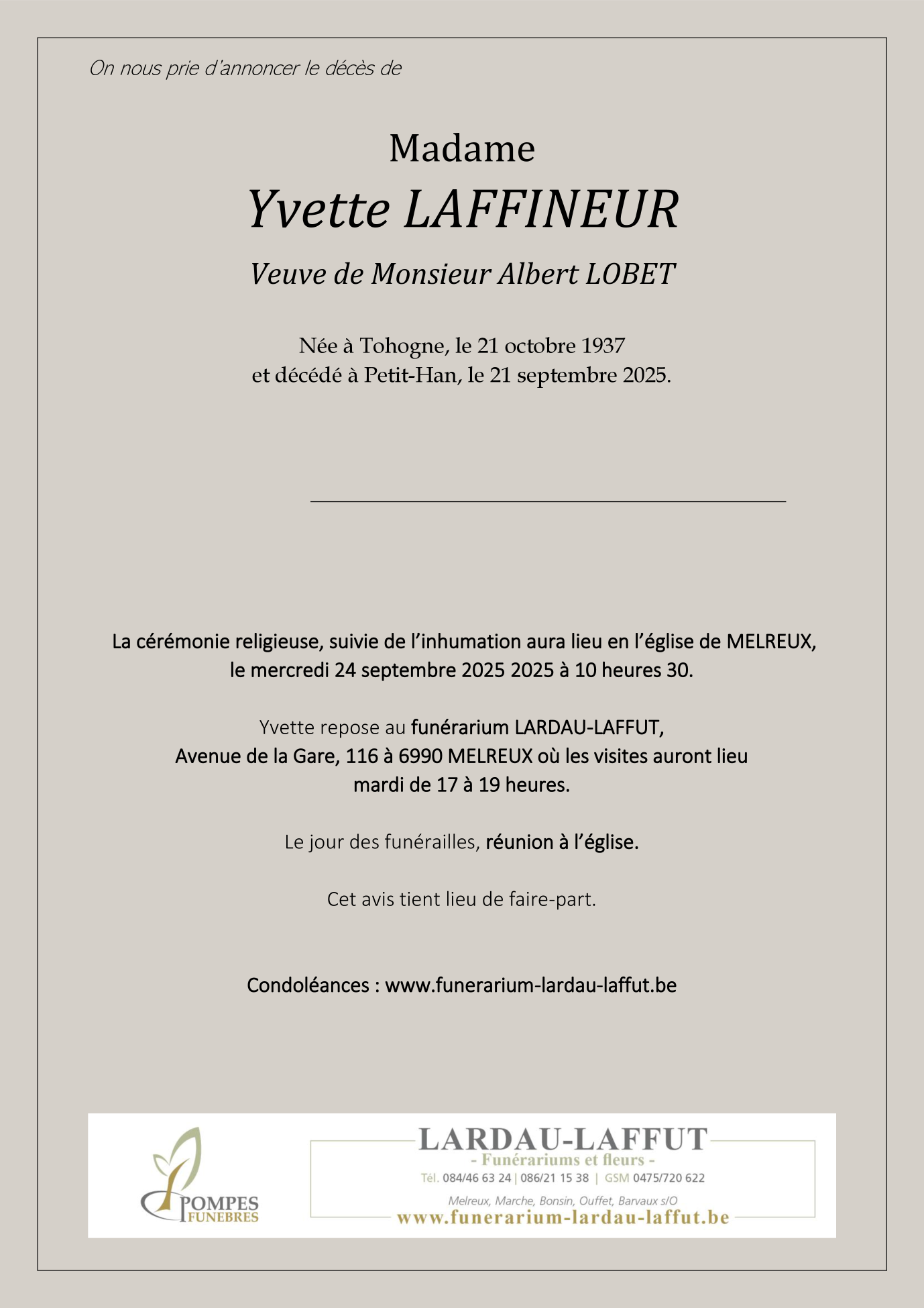 Décédée à Petit-Han (6940) le dimanche 21 septembre 2025 à l'âge de 87 ans