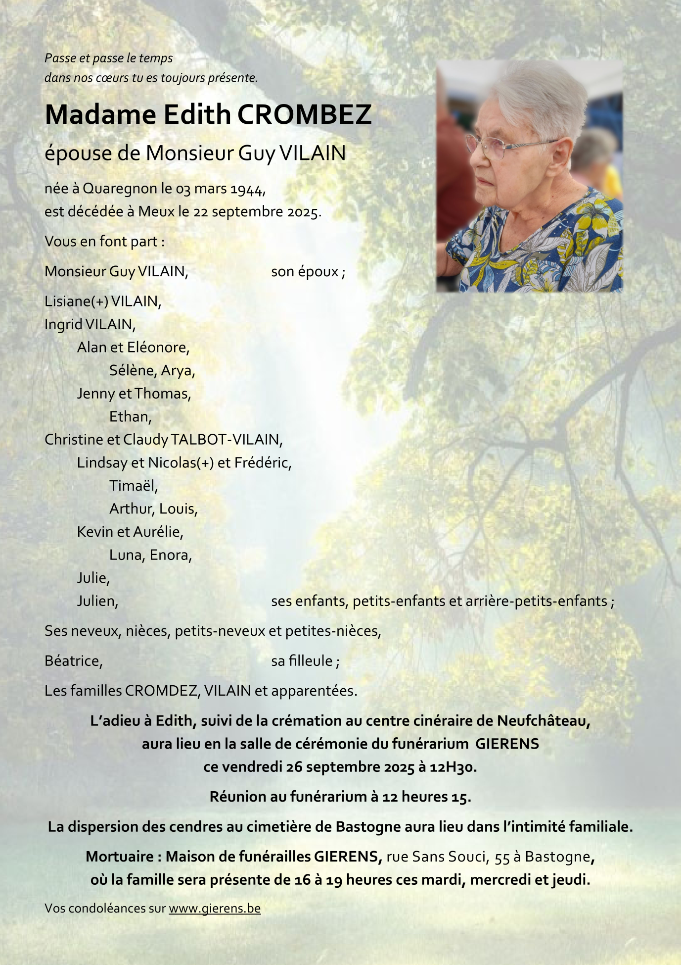 Décédée à Meux (5081) le lundi 22 septembre 2025 à l'âge de 81 ans