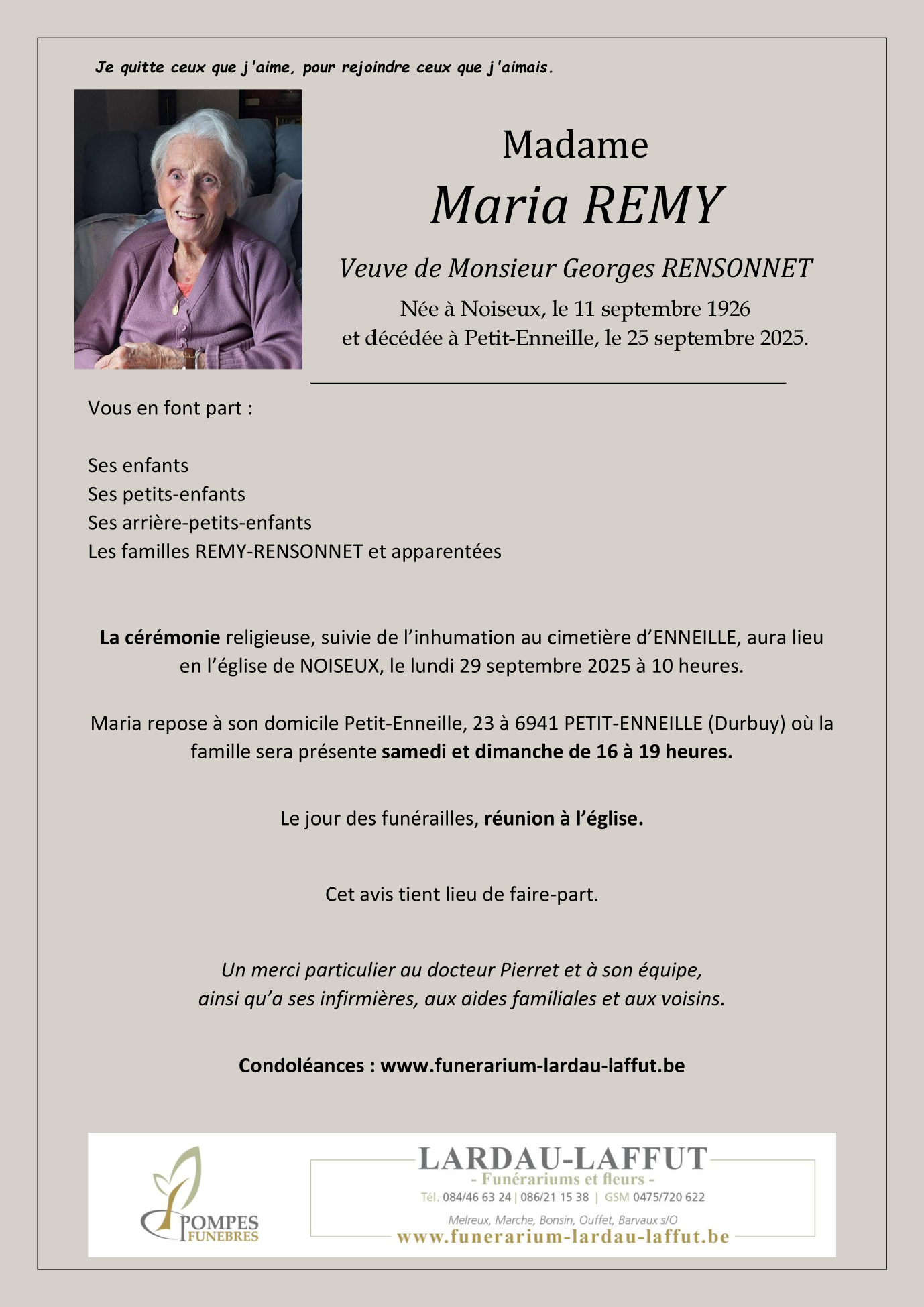 Décédée à Durbuy (6940) le jeudi 25 septembre 2025 à l'âge de 99 ans