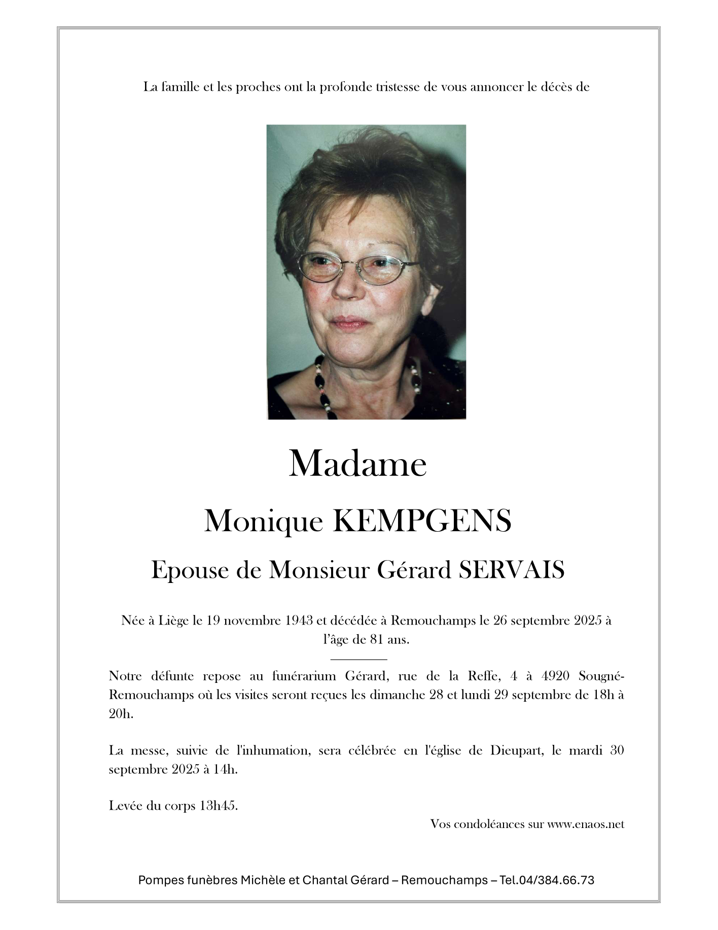 Décédée à Aywaille (4920) le vendredi 26 septembre 2025 à l'âge de 81 ans