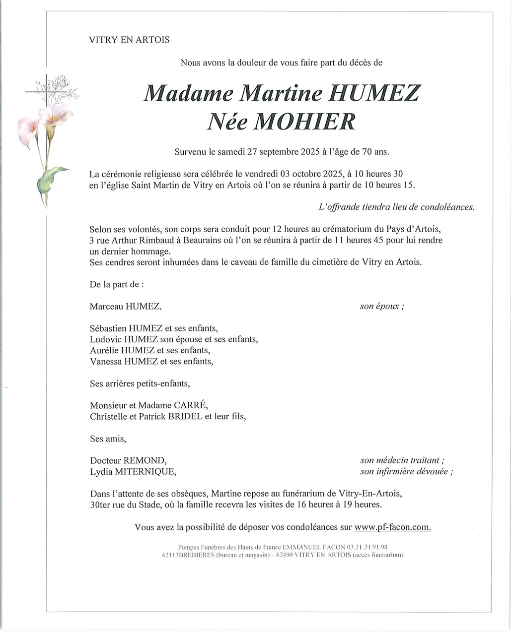 Décédée à Arras (62000, France) le samedi 27 septembre 2025 à l'âge de 70 ans