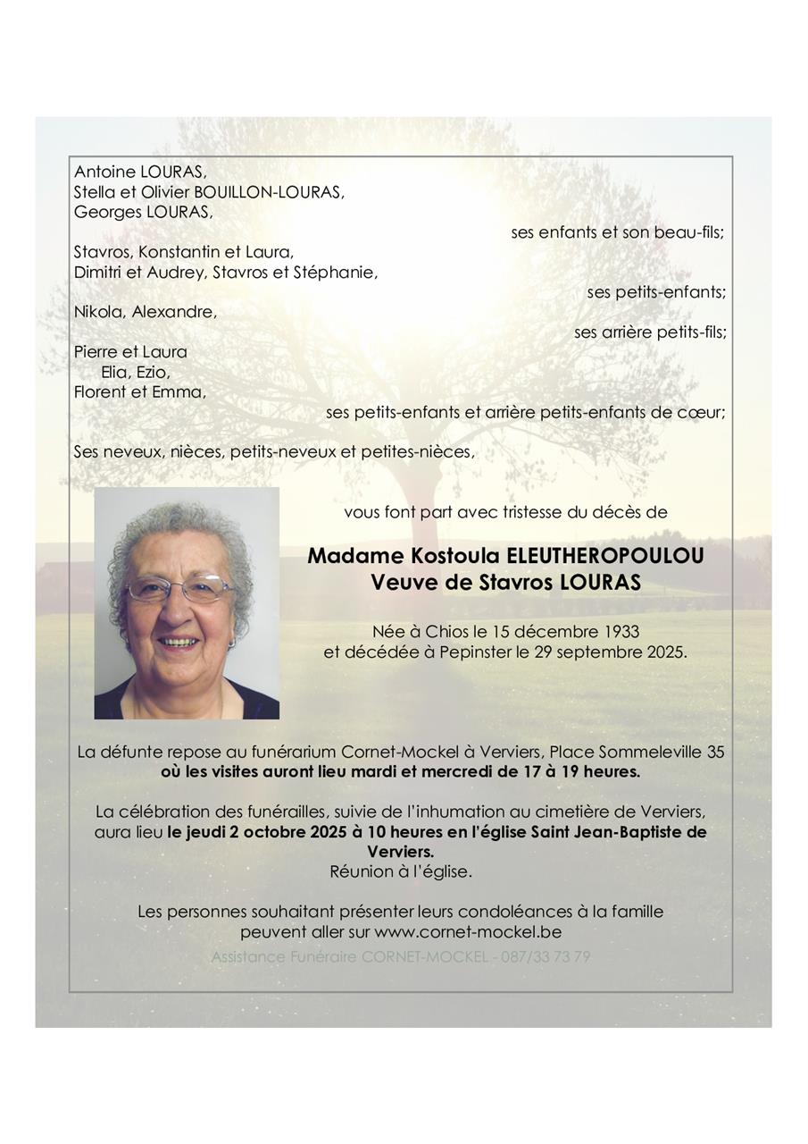 Décédée à Pepinster (4860) le lundi 29 septembre 2025 à l'âge de 91 ans