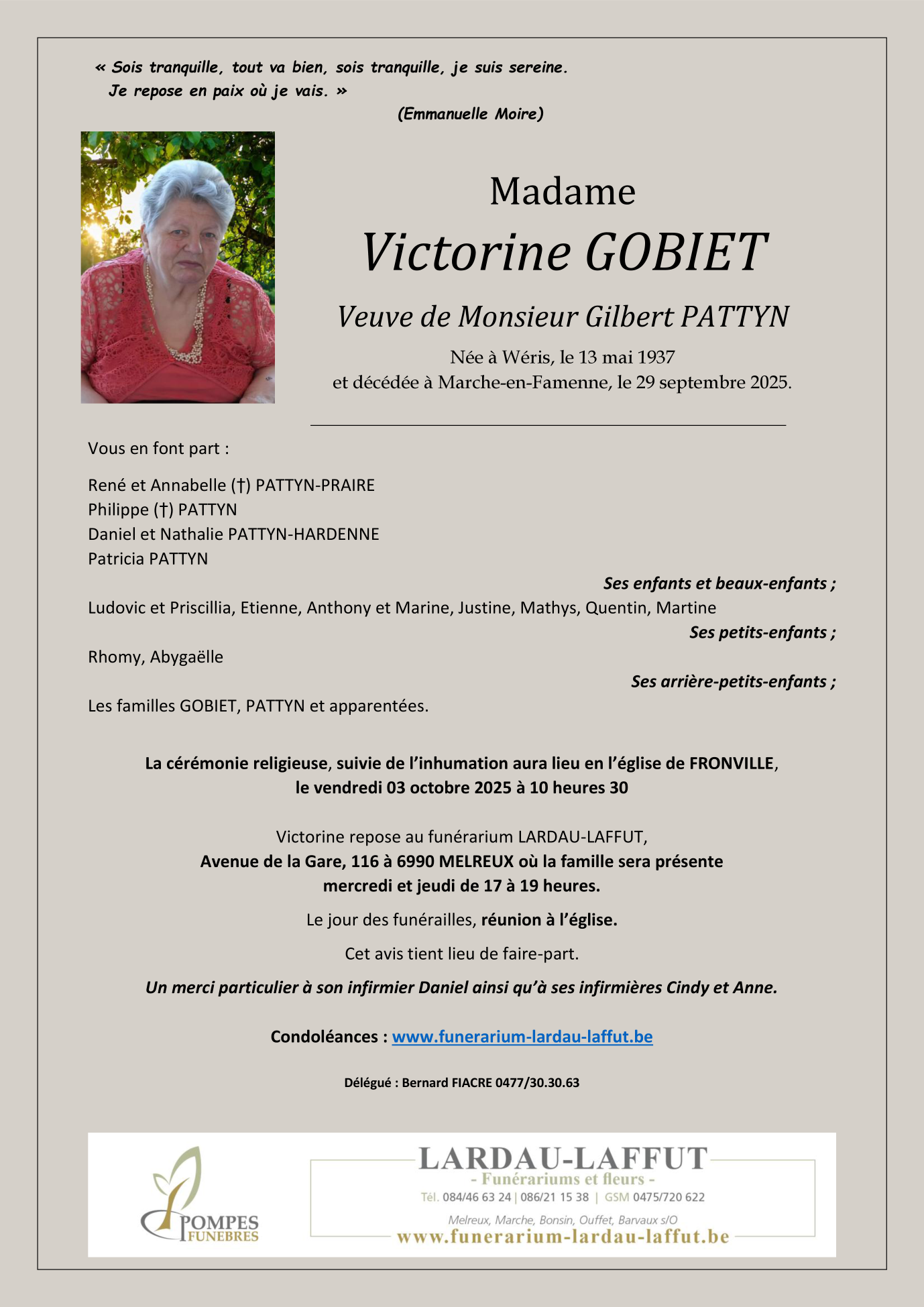 Décédée à Marche-en-Famenne (6900) le lundi 29 septembre 2025 à l'âge de 88 ans