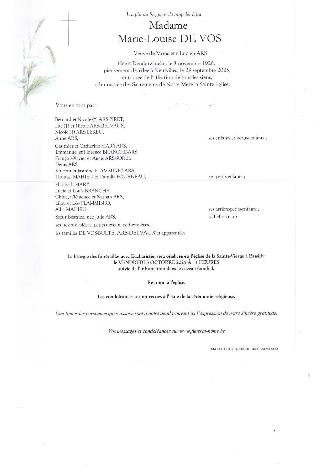 Décédée à Neufvilles (7063) le lundi 29 septembre 2025 à l'âge de 98 ans