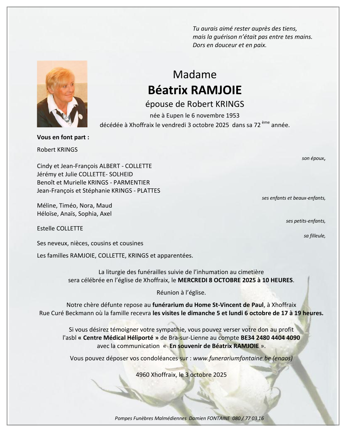 Décédée à Xhoffraix (4960) le vendredi 3 octobre 2025 à l'âge de 71 ans