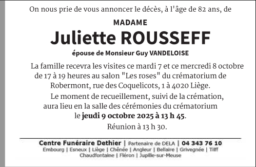 Décédée à Liège (4020) le vendredi 3 octobre 2025 à l'âge de 82 ans