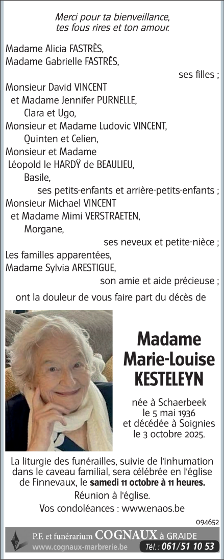 Décédée à Soignies (7060) le mardi 7 octobre 2025 à l'âge de 89 ans