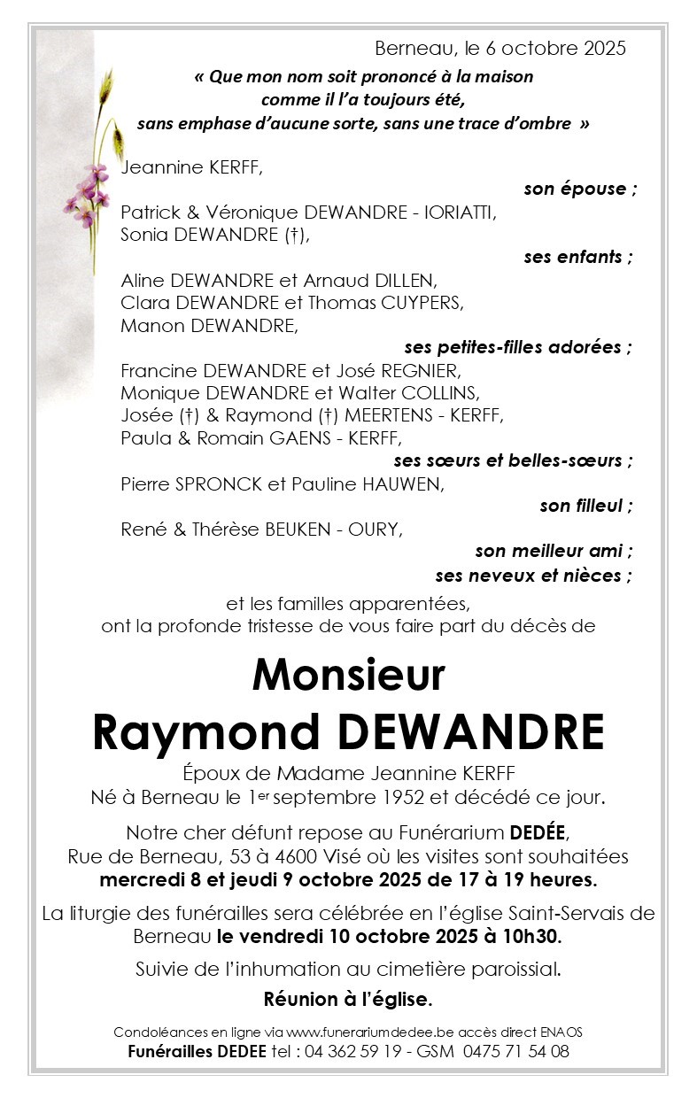 Décédé à Berneau (4607) le lundi 6 octobre 2025 à l'âge de 73 ans