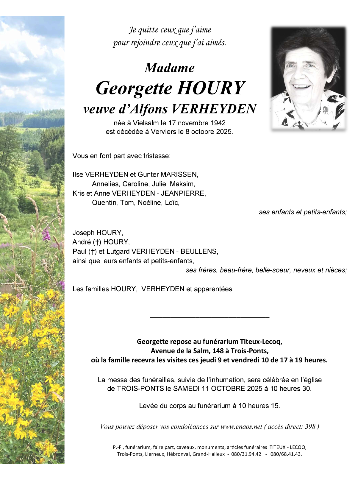 Décédée à Verviers (4800) le mercredi 8 octobre 2025 à l'âge de 82 ans