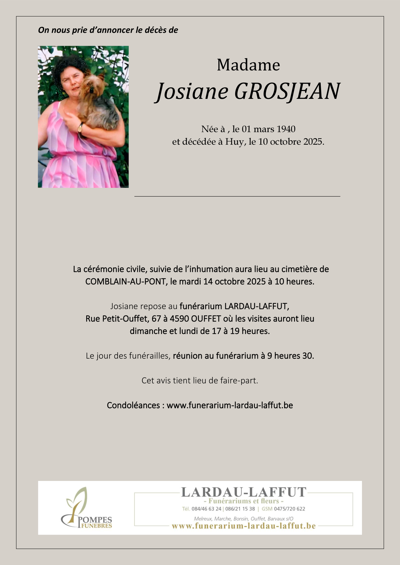 Décédée à Huy (4500) le vendredi 10 octobre 2025 à l'âge de 85 ans