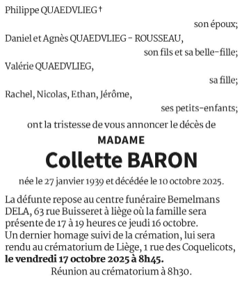 Décédée à Liège (4000) le vendredi 10 octobre 2025 à l'âge de 86 ans