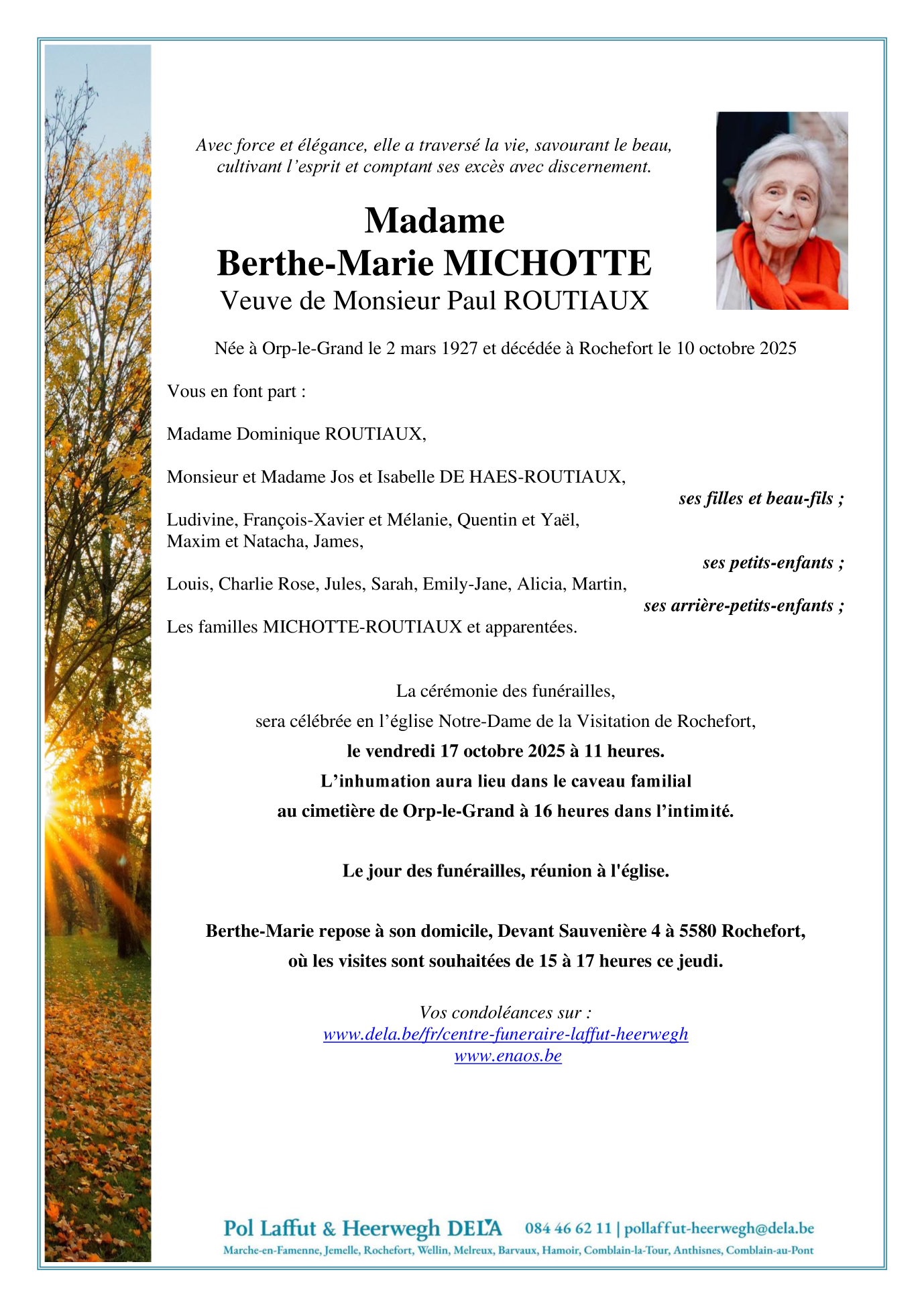 Décédée à Rochefort (5580) le vendredi 10 octobre 2025 à l'âge de 98 ans