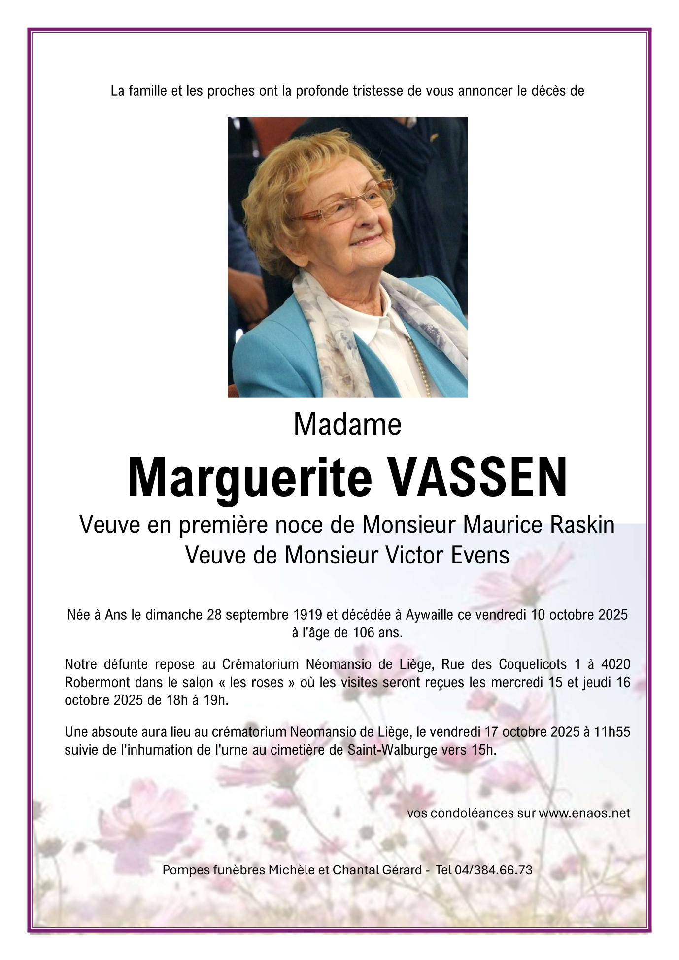 Died in Aywaille (4920) on 10 October 2025 at the age of 106 years