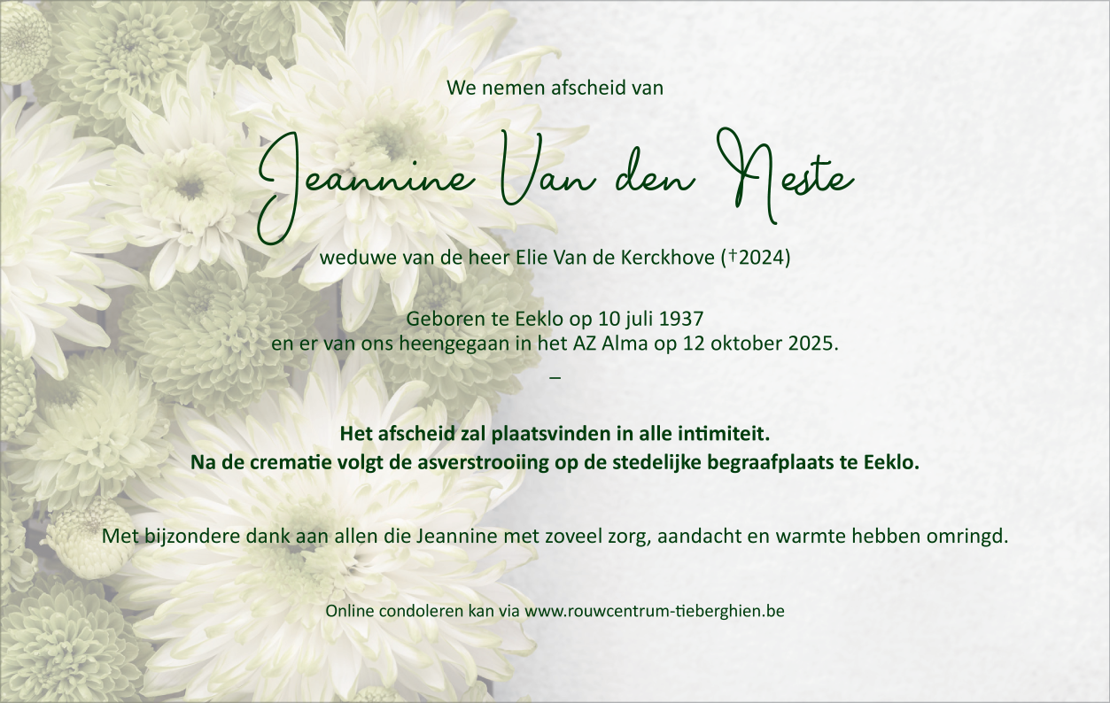 Fallecida en Eeklo (9900) el domingo, 12 de octubre de 2025 a la edad de 88 años
