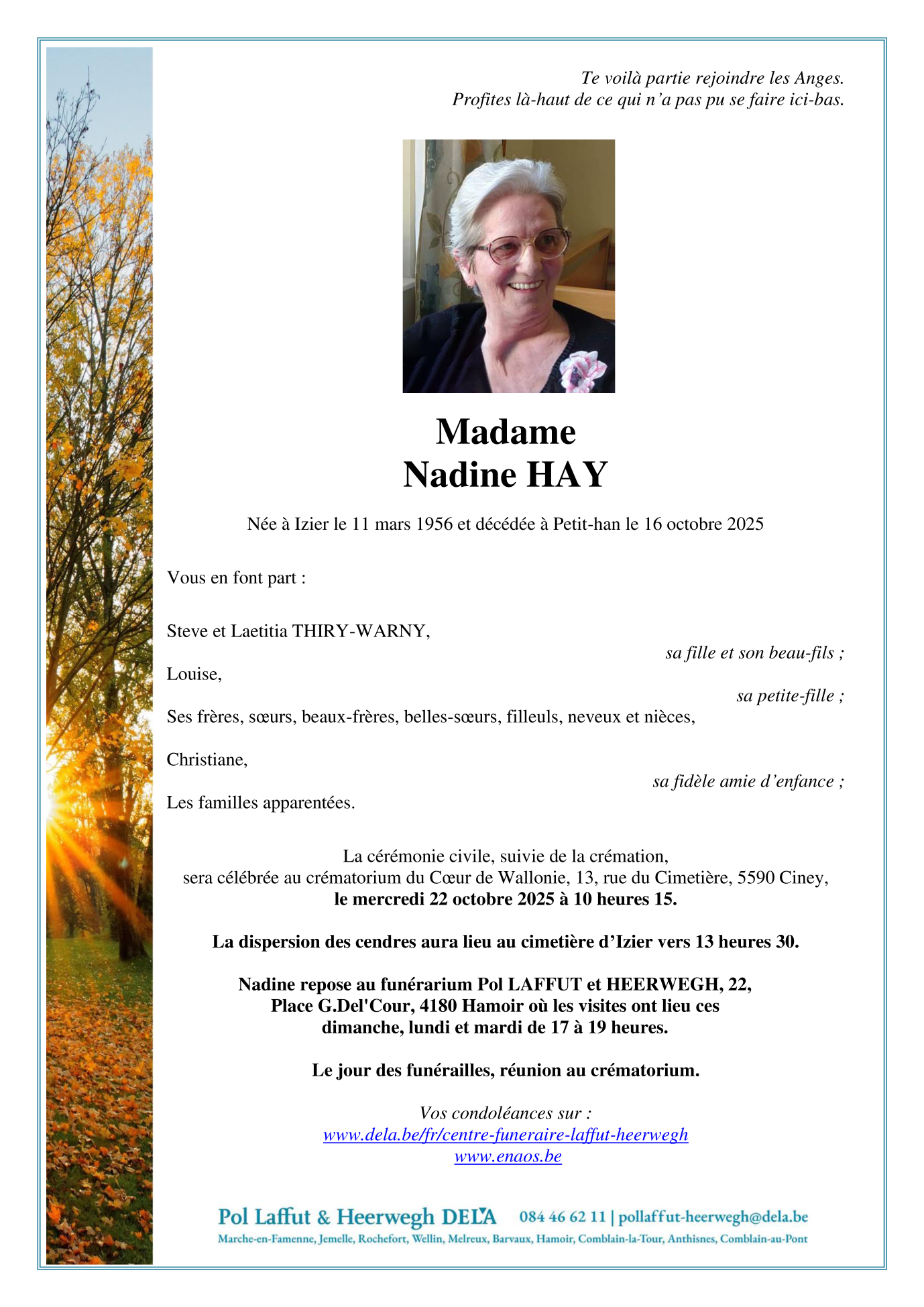 Décédée à Petit-Han (6940) le jeudi 16 octobre 2025 à l'âge de 69 ans