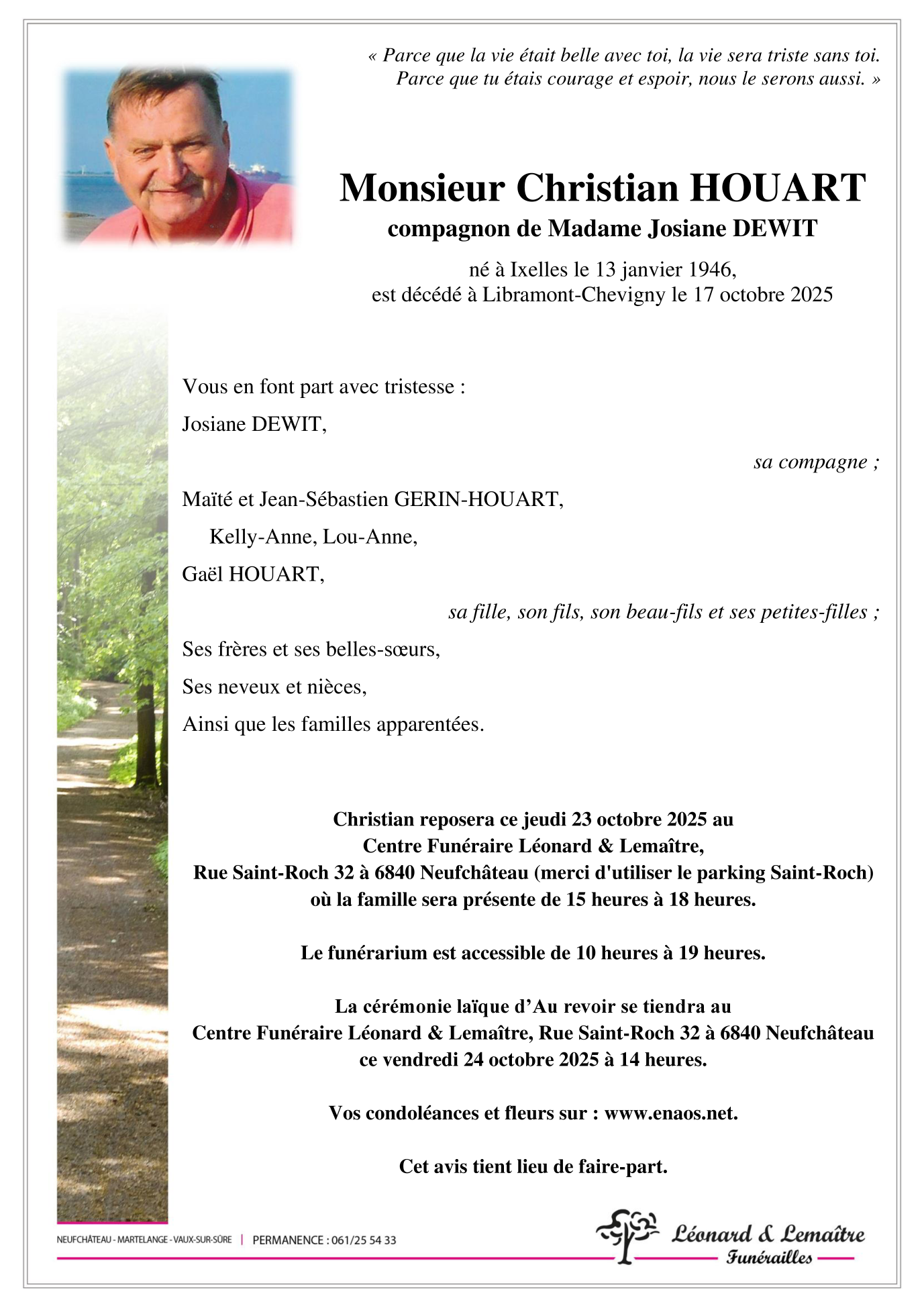 Died in Libramont-Chevigny (6800) on 17 October 2025 at the age of 79 years