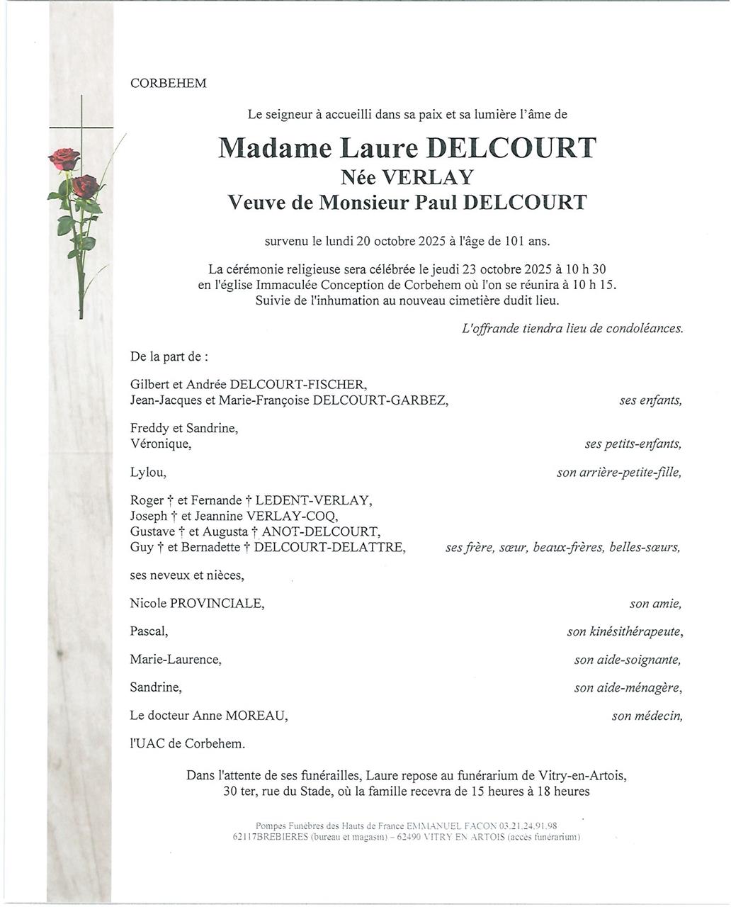 Décédée à Corbehem (62112, France) le lundi 20 octobre 2025 à l'âge de 101 ans