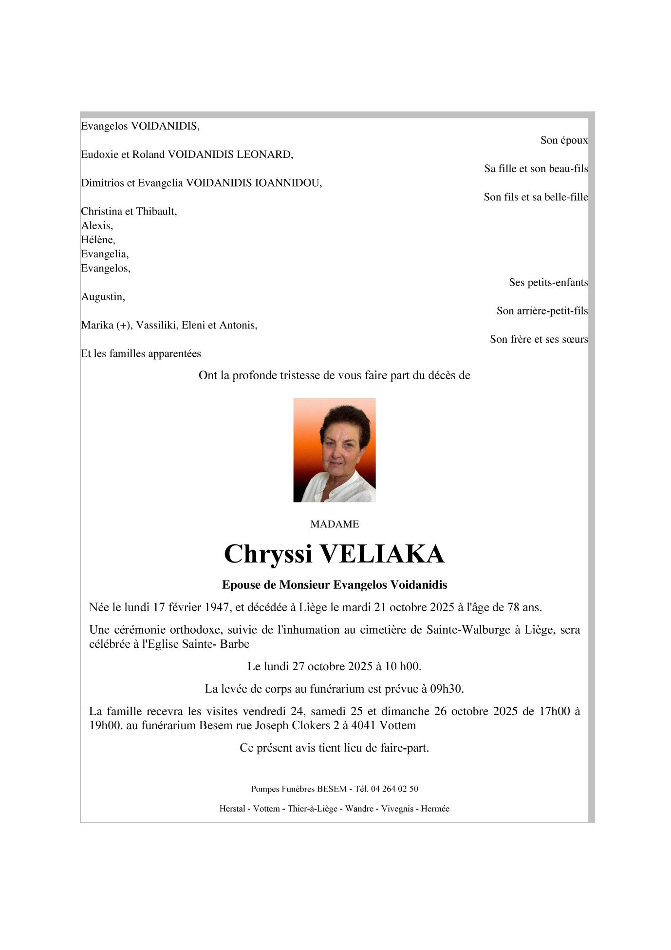 Décédée à Liège (4000) le mardi 21 octobre 2025 à l'âge de 78 ans