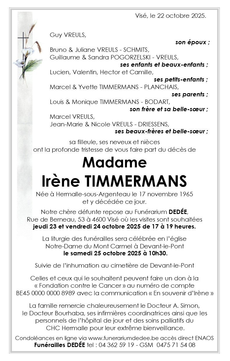 Décédée à Hermalle-sous-Argenteau (4681) le mercredi 22 octobre 2025 à l'âge de 59 ans