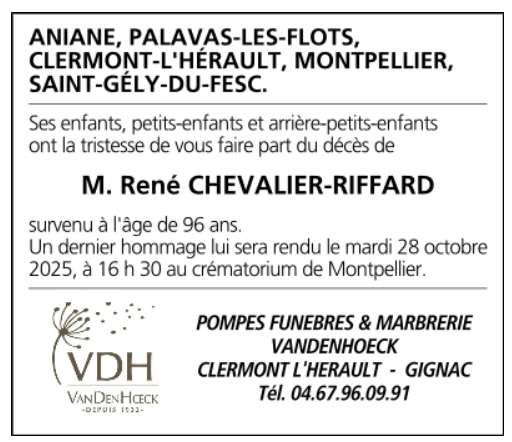 Décédé à Saint-Pargoire (34230, France) le vendredi 24 octobre 2025 à l'âge de 96 ans