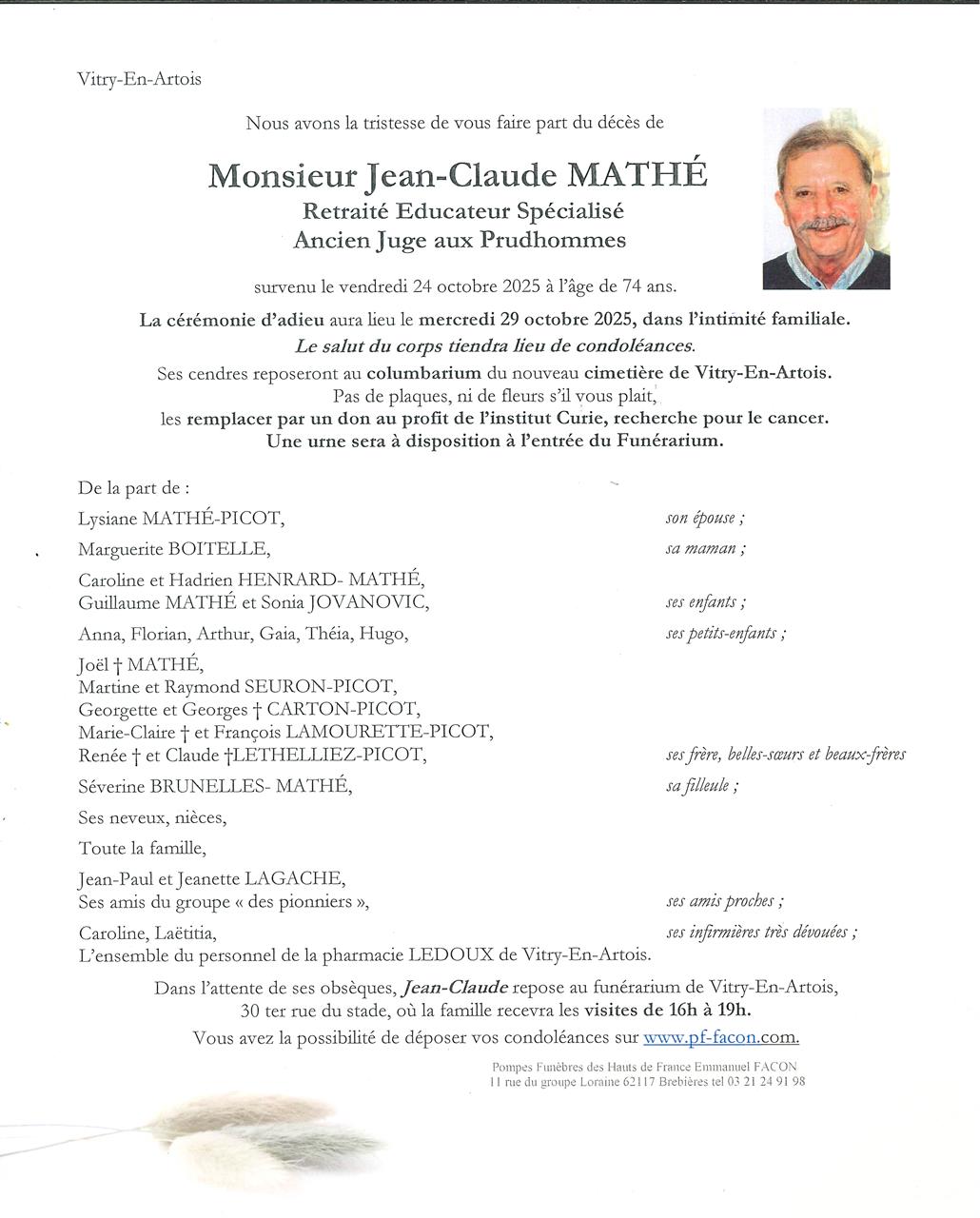 Décédé à Dechy (59187, France) le vendredi 24 octobre 2025 à l'âge de 74 ans