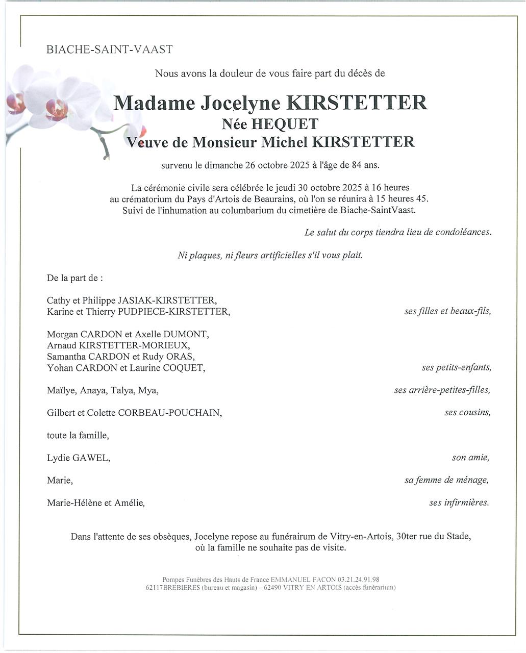 Décédée à Biache-Saint-Vaast (62118, France) le dimanche 26 octobre 2025 à l'âge de 84 ans