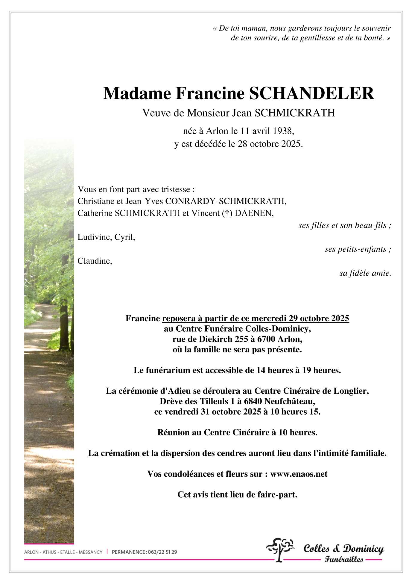 Décédée à Arlon (6700) le mardi 28 octobre 2025 à l'âge de 87 ans