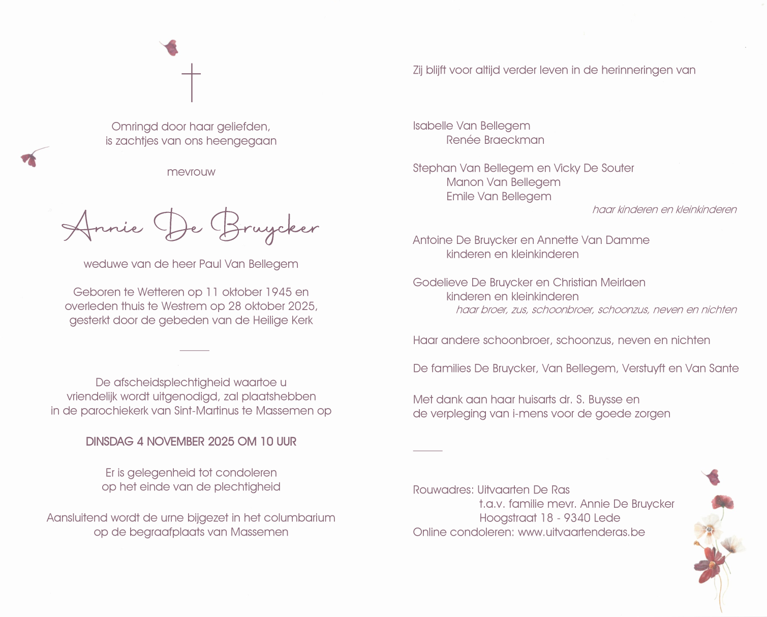 Décédée à Westrem (9230) le mardi 28 octobre 2025 à l'âge de 80 ans