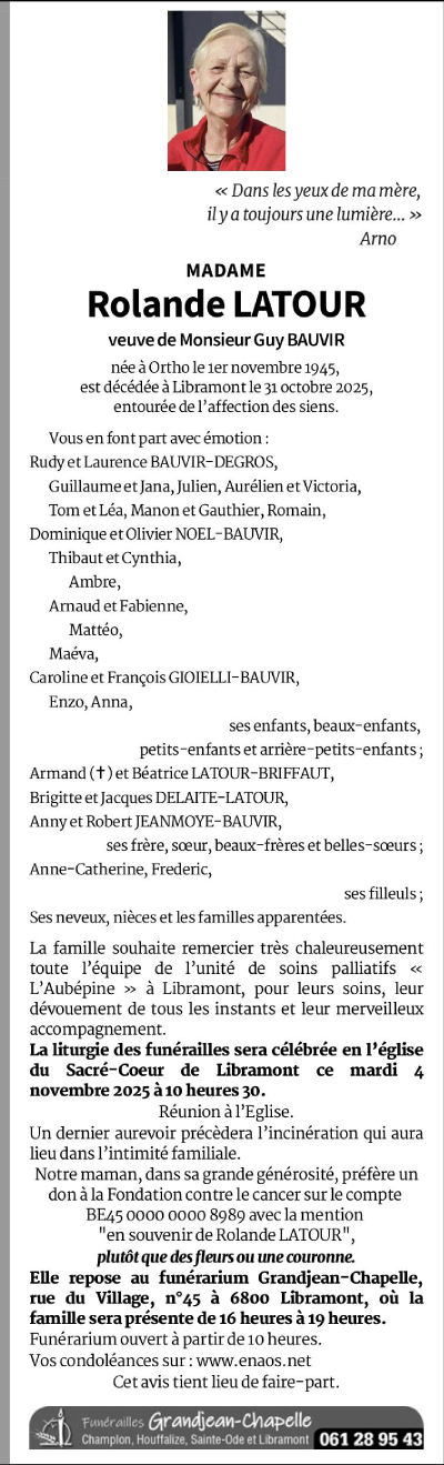 Décédée à Libramont (6800) le vendredi 31 octobre 2025 à l'âge de 79 ans