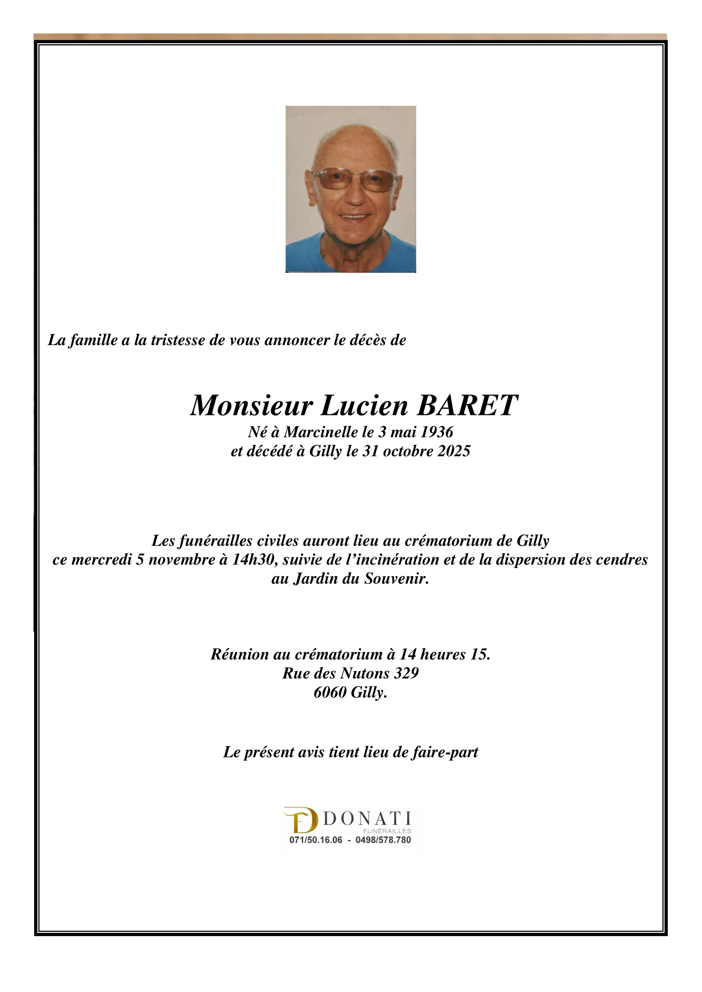 Décédé à Gilly (6060) le vendredi 31 octobre 2025 à l'âge de 89 ans