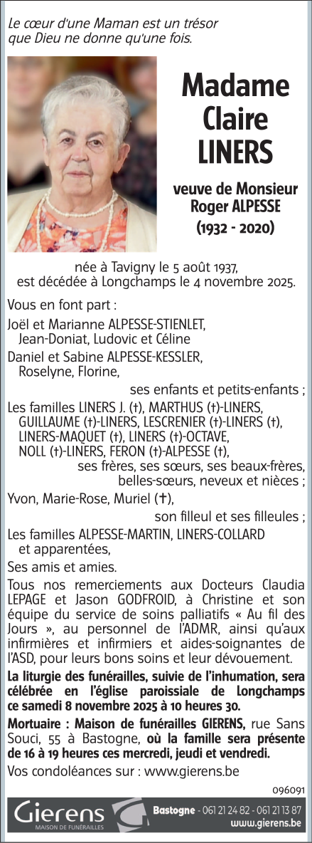 Décédée à Longchamps (Lux.) (6688) le mardi 4 novembre 2025 à l'âge de 88 ans