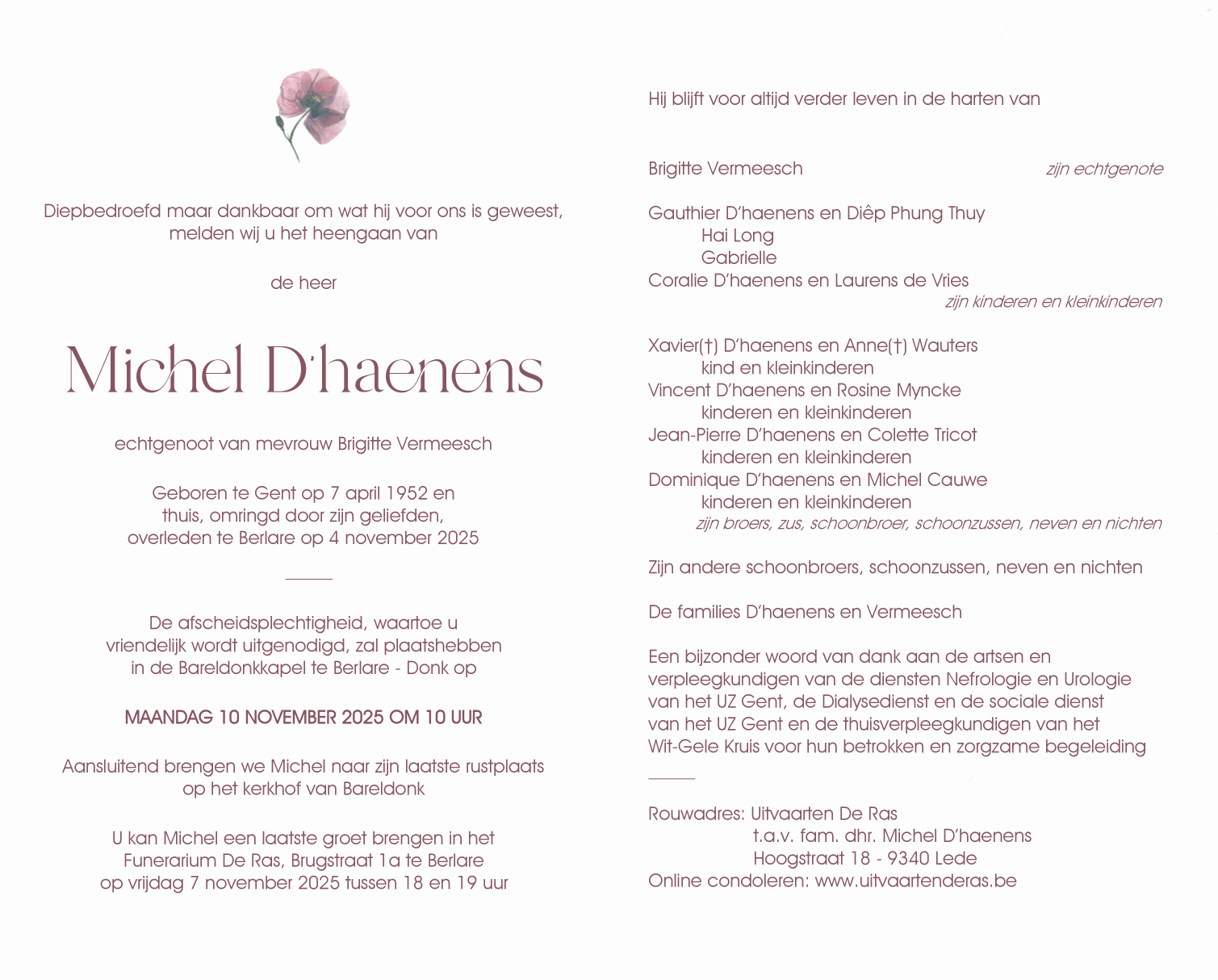 Décédé à Berlare (9290) le mardi 4 novembre 2025 à l'âge de 73 ans