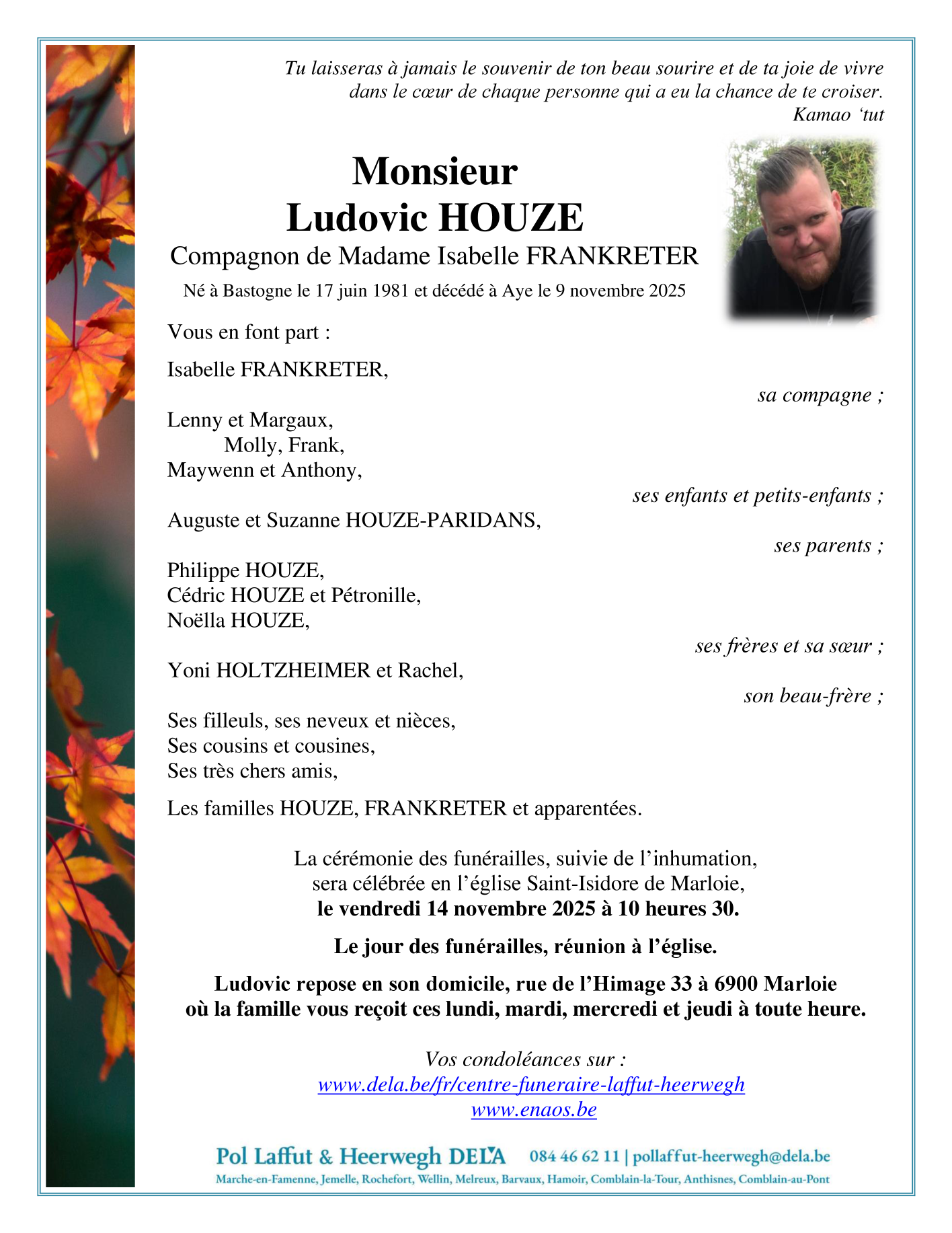 Décédé à Aye (6900) le dimanche 9 novembre 2025 à l'âge de 44 ans