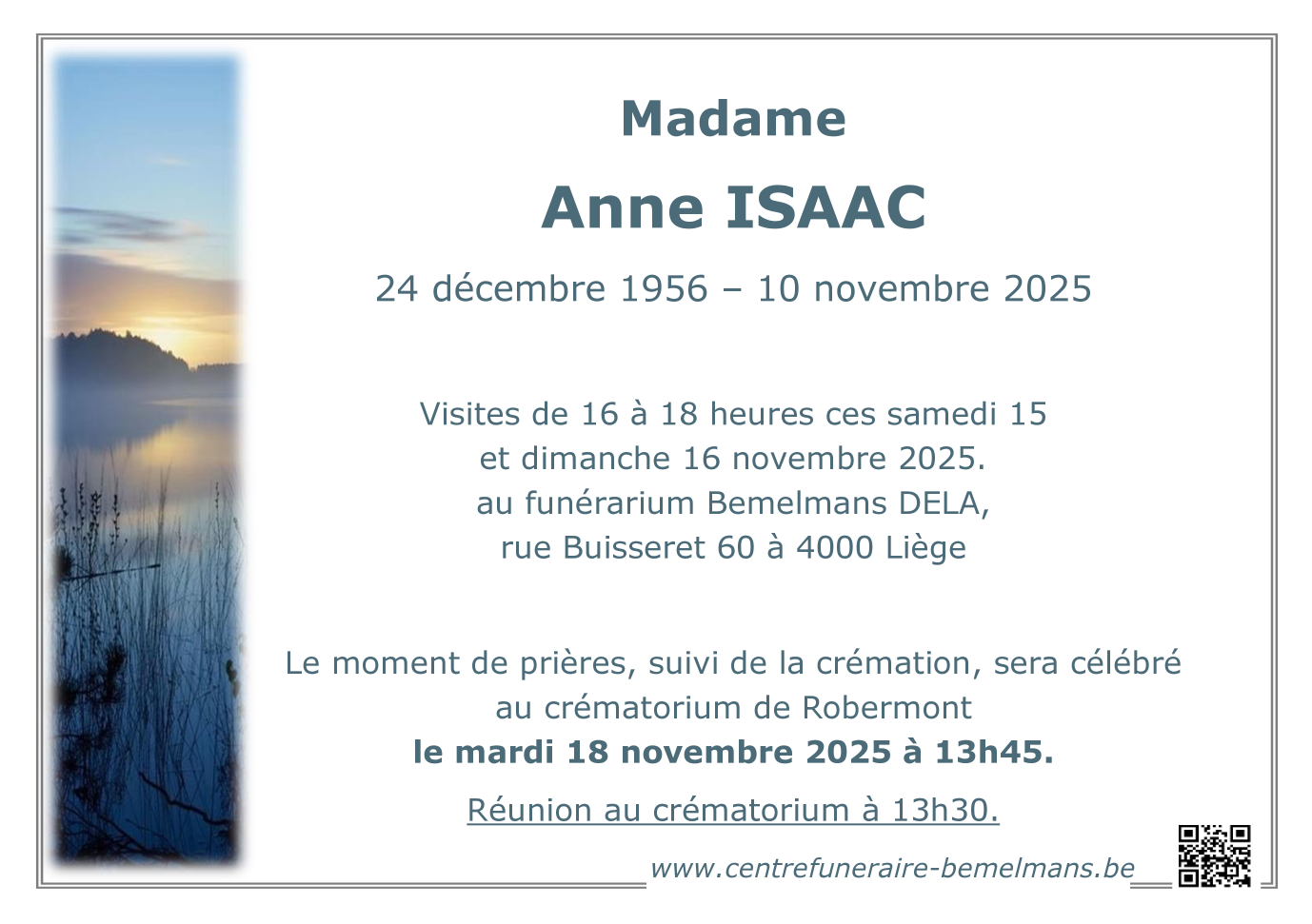 Décédée à Liège (4000) le lundi 10 novembre 2025 à l'âge de 68 ans