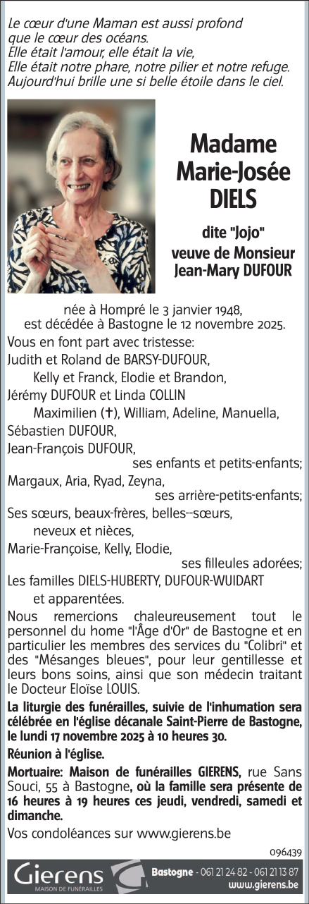 Décédée à Bastogne (6600) le mercredi 12 novembre 2025 à l'âge de 77 ans