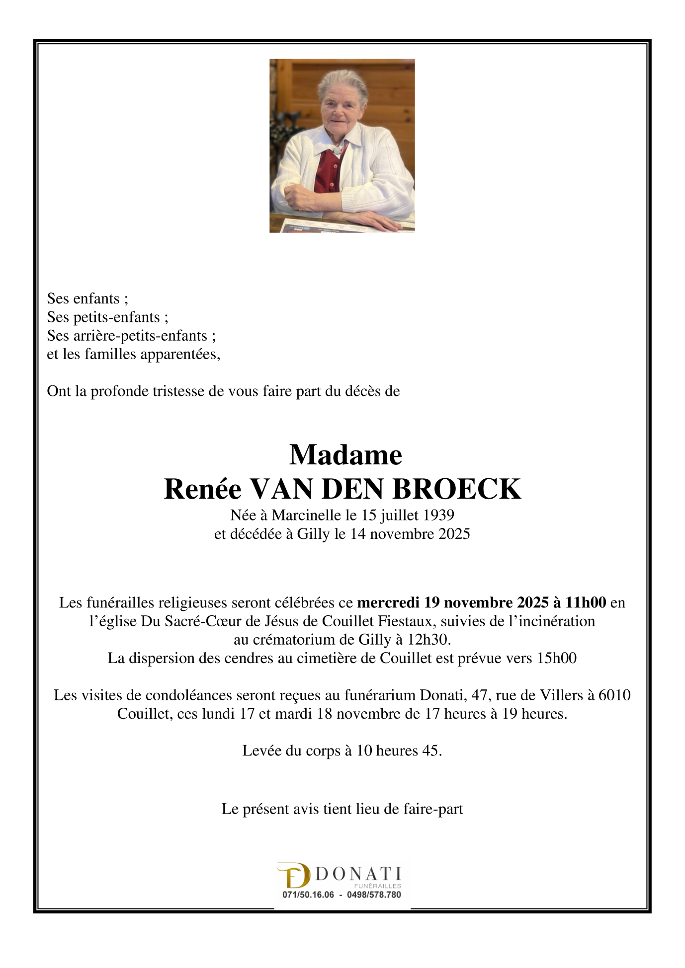 Décédée à Gilly (6060) le vendredi 14 novembre 2025 à l'âge de 86 ans