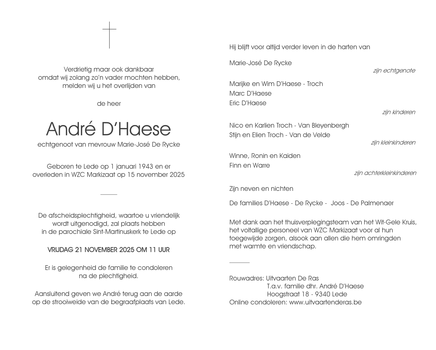 Décédé à Lede (9340) le samedi 15 novembre 2025 à l'âge de 82 ans