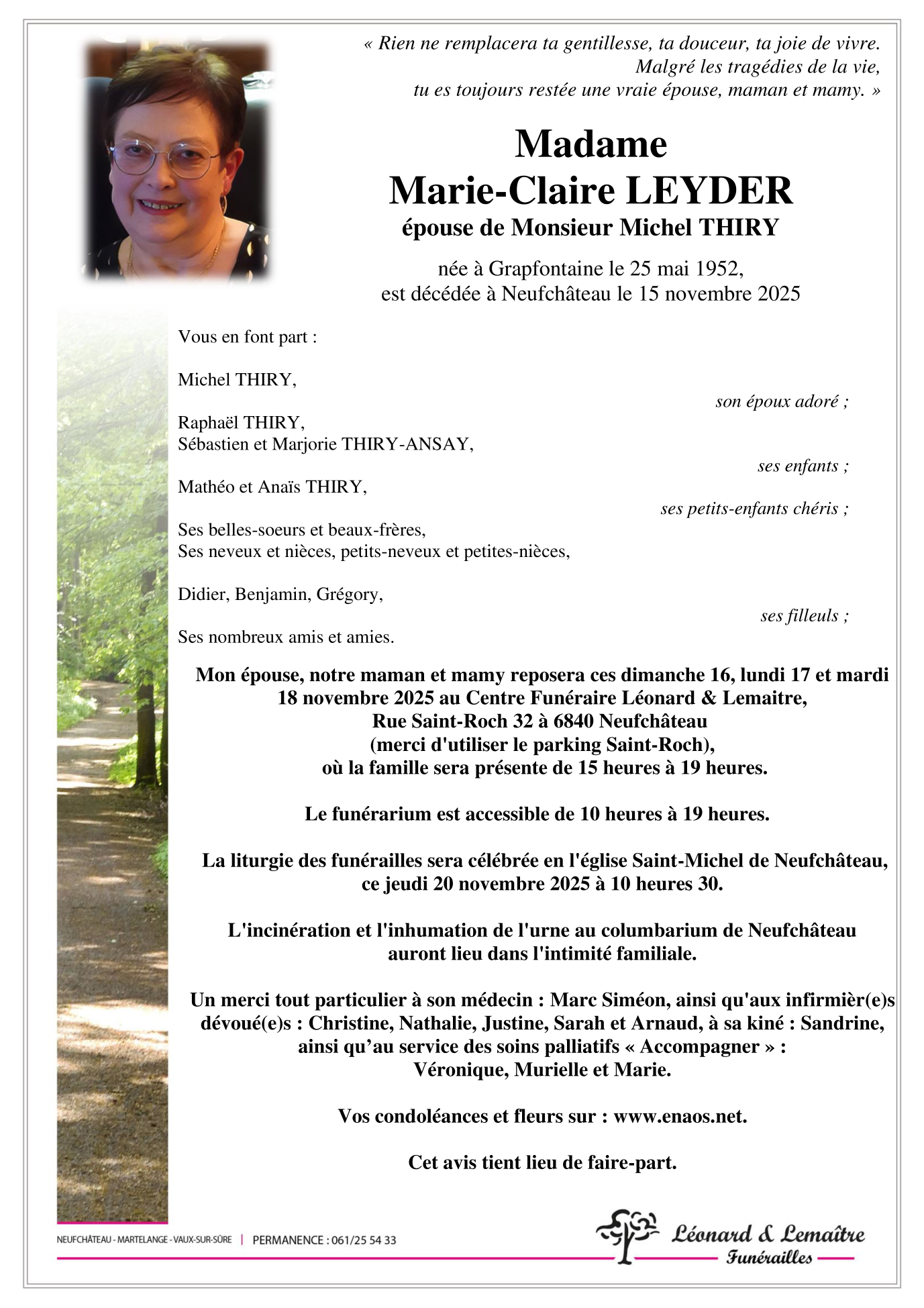 Décédée à Neufchâteau (6840) le samedi 15 novembre 2025 à l'âge de 73 ans