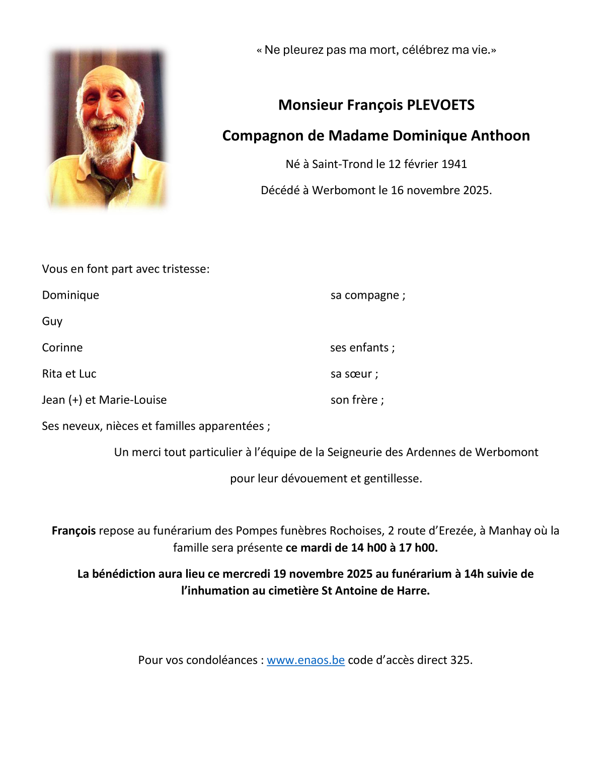 Décédé à Werbomont (4190) le dimanche 16 novembre 2025 à l'âge de 84 ans