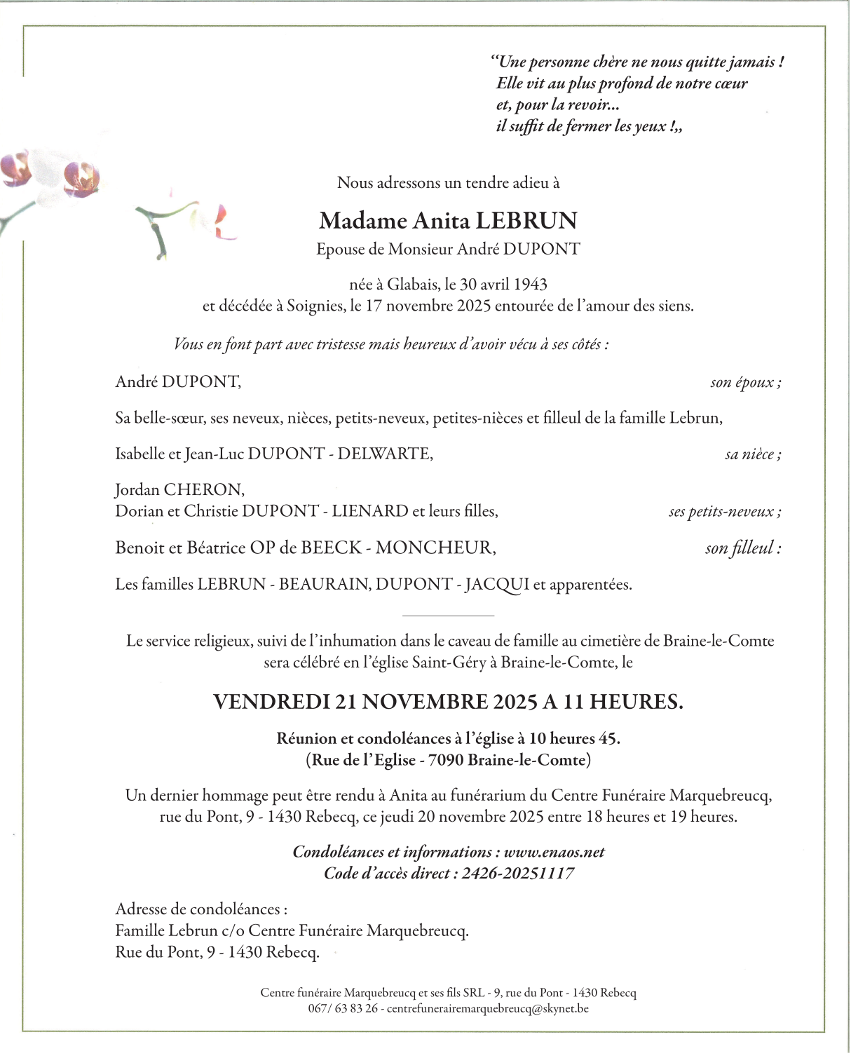 Décédée à Soignies (7060) le lundi 17 novembre 2025 à l'âge de 82 ans