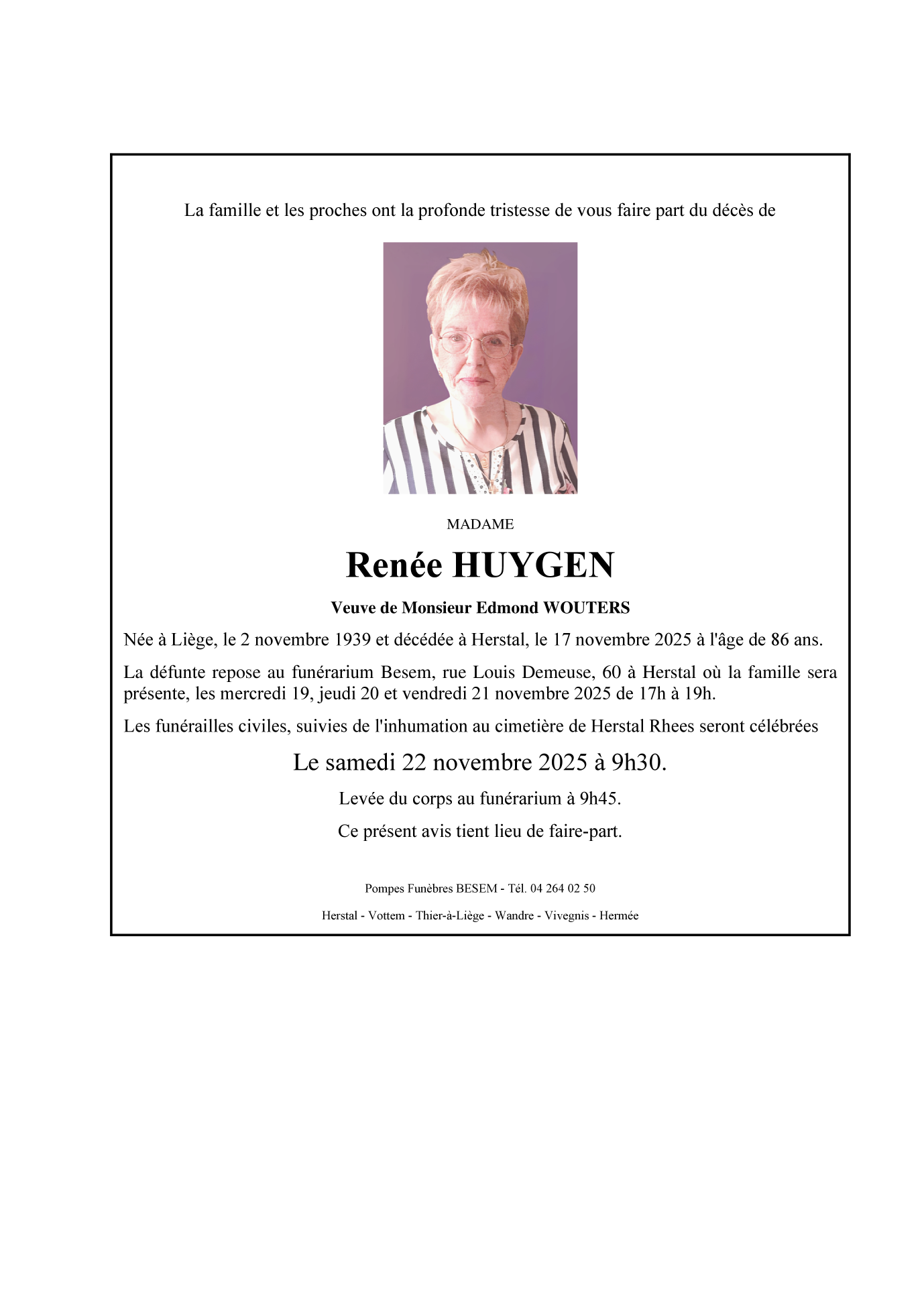 Décédée à Herstal (4040) le lundi 17 novembre 2025 à l'âge de 86 ans